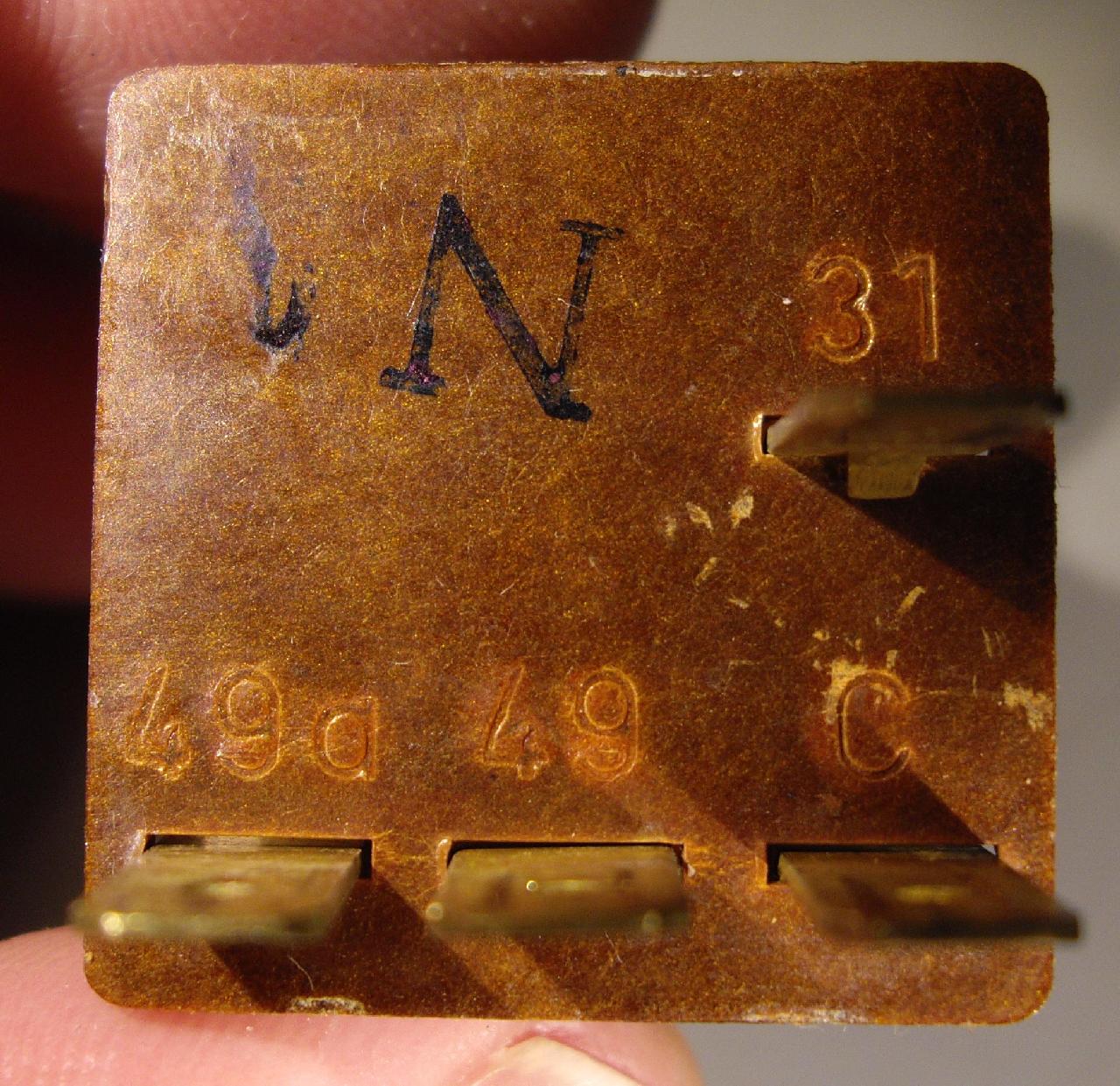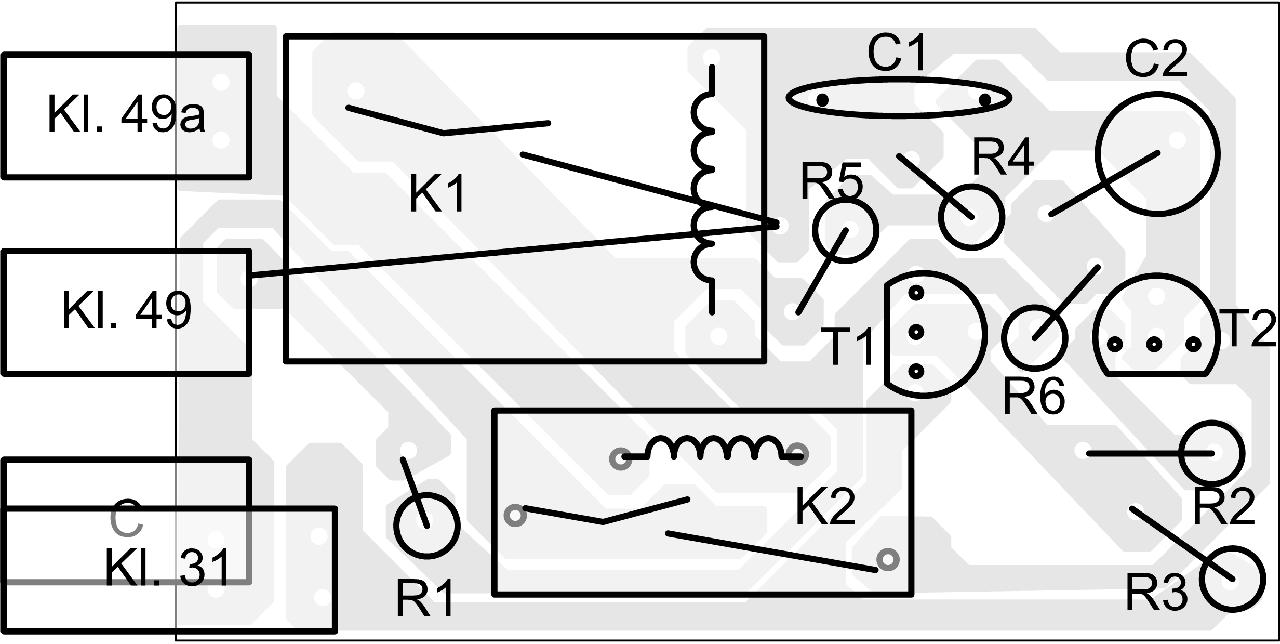 Ursache scheint ein Feinschluss im Relais K2 zu sein, durch den Klemme C auch bei offenen Kontakten an +12 V liegt. Der Durchgangswiderstand variiert von Exemplar zu Exemplar, liegt aber meist im Bereich zwischen ca. 50 und 100 Ohm. Ob dieser Fehler vorliegt, kann ganz einfach durch eine Widerstandsmessung zwischen den Klemmen 49 und C des ausgebauten Blinkgebers festgestellt werden. Bei einem einwandfreien Relais K2 darf im ausgebauten Zustand des Blinkgebers keine Verbindung messbar sein. Ist zwischen den Klemmen 49 und C ein Widerstand messbar, der nicht im Bereich von MΩ liegt, hat der Kontaktsatz von K2 den beschriebenen Feinschluss.