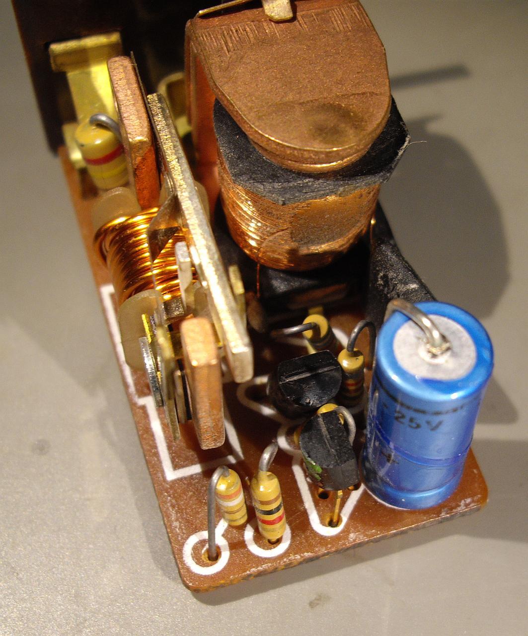 Mit Lasche „1“ stellt man die Ruheposition des Ankers ein. Der Abstand zwischen Anker und dem Relaiskontakt (die versilberte schmale Blechfahne) sollte wenige 1/10 mm betragen.