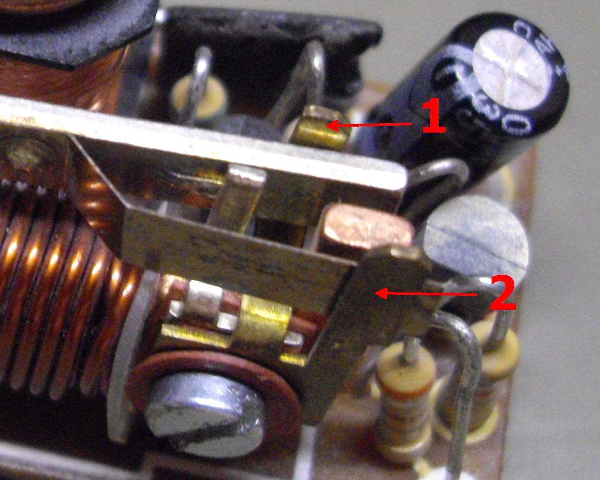 Nach der Reparatur des Stromrelais K2 muss es so eingestellt werden, dass es bei einer Last von 2 Glühlampen zu 12V/21W sicher anspricht. Bei einer Last von nur einer Glühlampe soll es nur einmal (im ersten Blinktakt) anziehen und dann nicht mehr. Dies geschieht durch vorsichtiges Verbiegen der beiden in Abbildung 10 sichtbaren Messinglaschen „1“ und „2“.