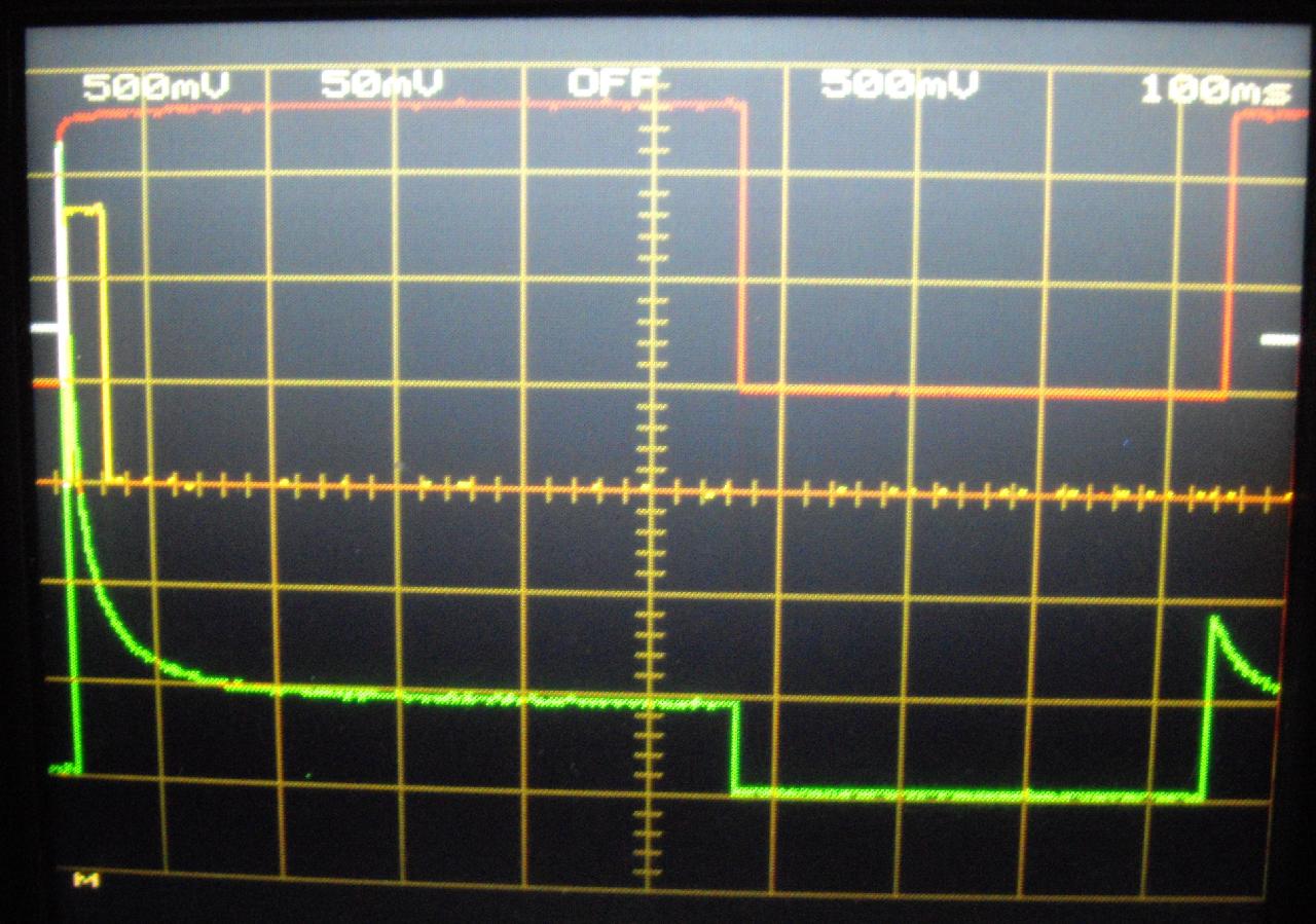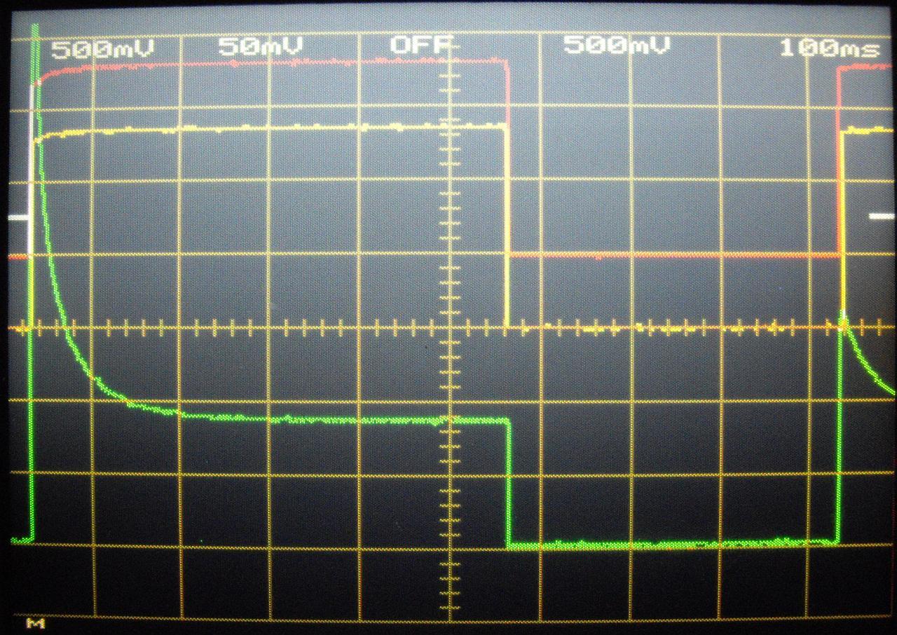 Sind zwei Blinkerlampen zu 21 W angeschlossen (Abbildung 8), zieht K2 an, solange der Lampenstrom fließt, die BKL leuchtet damit im Takt der Blinker mit. Man sieht auch, dass Glühlampen beim Einschalten aus dem kalten Zustand kurzzeitig einen deutlich höheren Strom ziehen, der gut das dreifache des Nennstroms beträgt. Beim erneuten Einschalten im zweiten Blinktakt ist die Lampe noch nicht komplett abgekühlt, die Stromspitze ist deutlich geringer.